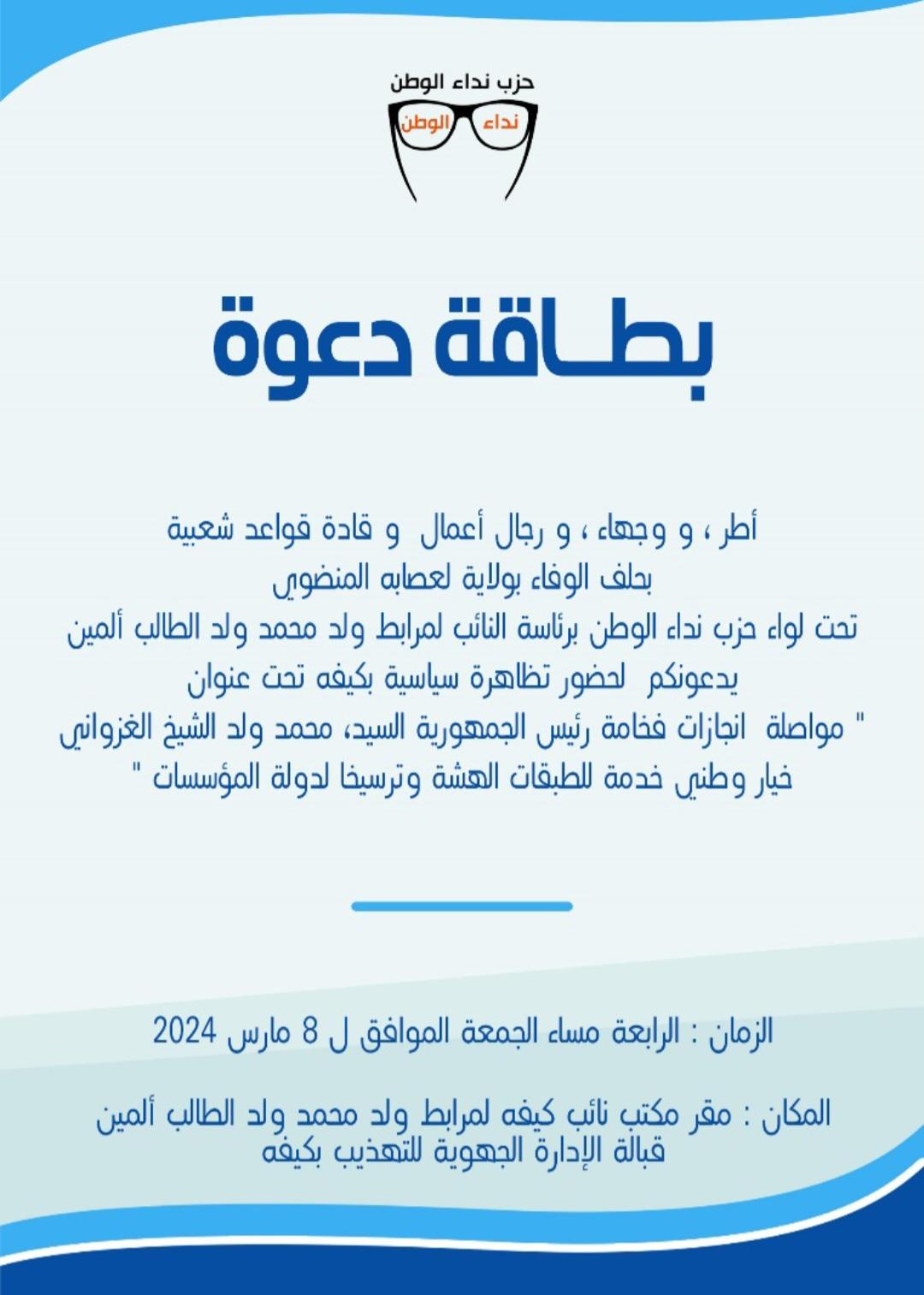 دعا حلف الوفاء بولاية لعصابه الذي يترأسه النائب لمرابط ولد محمد ولد الطالب ألمين أنصاره إلى تظاهرة سياسية سينظمها مساء غد الجمعة بمدينة كيفه حول " تثمين انجازات رئيس الجمهورية وضرورة مواصلة هذه الانجازات خدمة للطبقات الهشة و دولة المؤسسات .