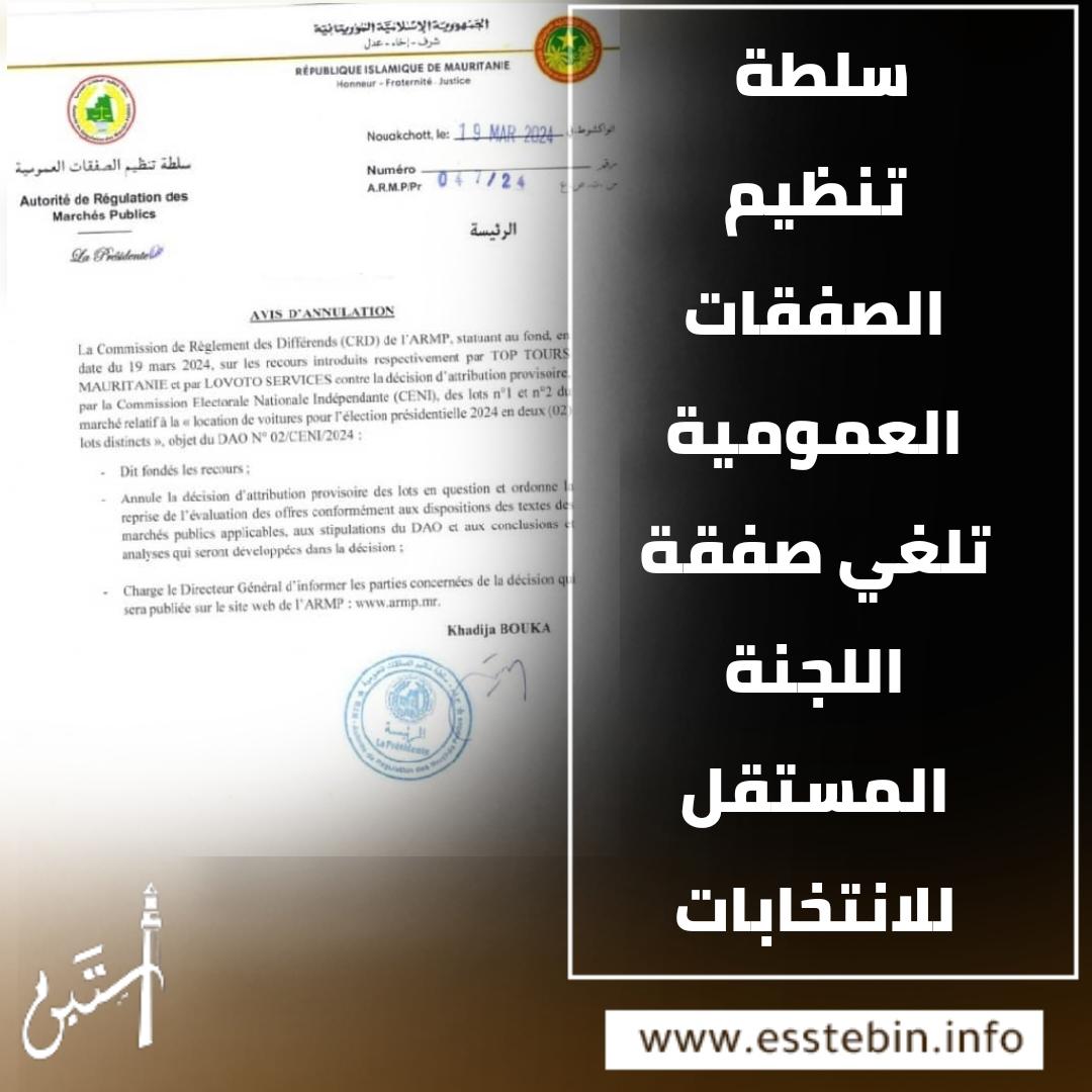 ألغت سلطة تنظيم الصفقات العمومية الصفقة التي منحتها اللجنة الوطنية المستقلة للانتخابات لوكالة "آفالاه رانت أكار" لتوفير 106 سيارات لمدة 120 يوما، وبمبلغ يتجاوز 227 مليون أوقية قديمة.